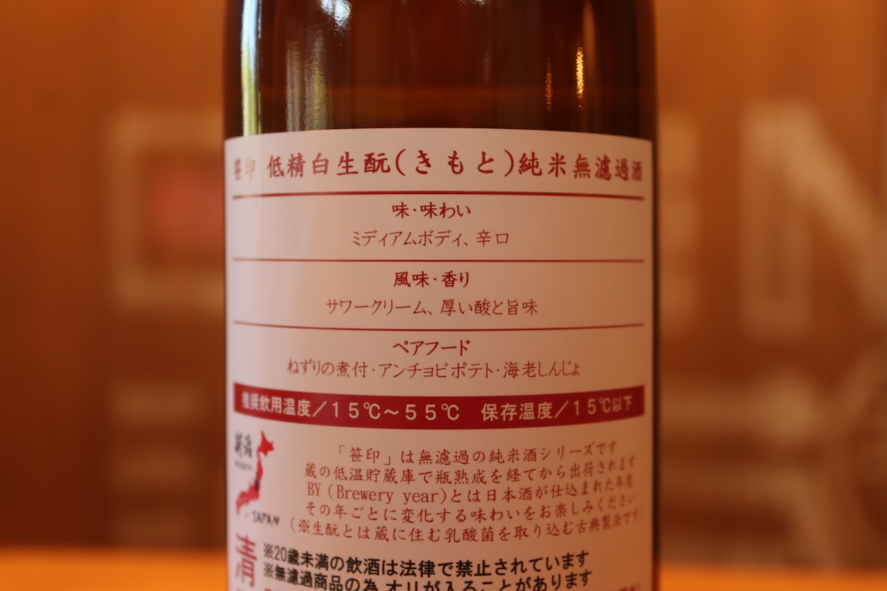 「笹印 低精白 生酛純米無濾過酒」では、酒蔵に住みつく天然の乳酸菌を取り込む古典製法「生酛(きもと)仕込み」を採用しています。原材料は「米・水・酵母・コウジカビ」のみ。その他の醗酵補助剤や、記載義務のない一切の添加物を使用していません。