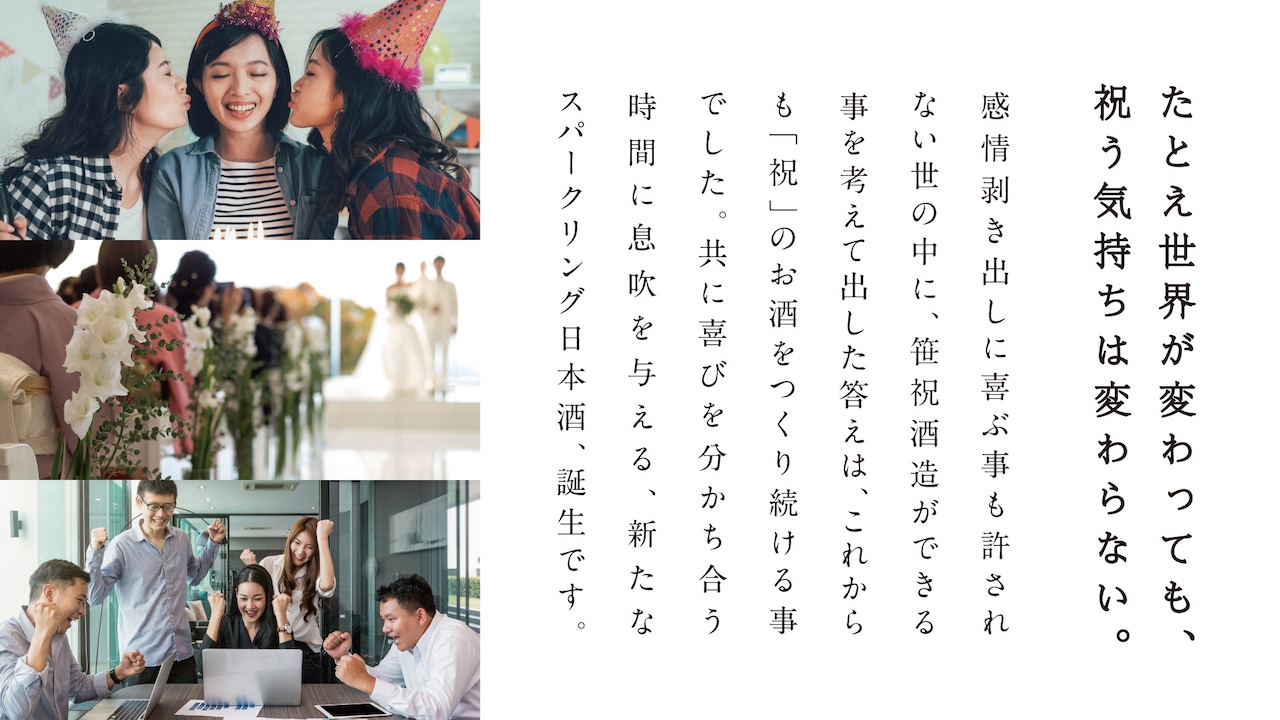 たとえ世界が変わっても、祝う気持ちは変わらない。感情剥き出しに喜ぶことも許されない世の中に、笹祝酒造が出来る事を考えて出した答えは、これからも「祝」と共にある日本酒を造り続ける事でした。誕生祝、結婚祝、プロジェクトの成功、スポーツの応援、記念日。日常には様々な「祝い」のシーンがあります。笹祝酒造は祝酒。立ち上がる美しい細かな泡が皆様の嬉しい時、楽しい時を更に特別な時とすることを願っています。